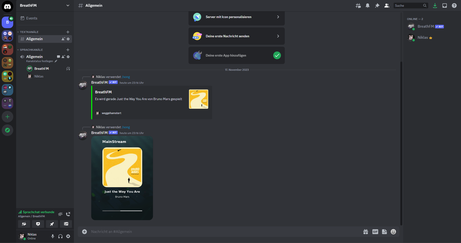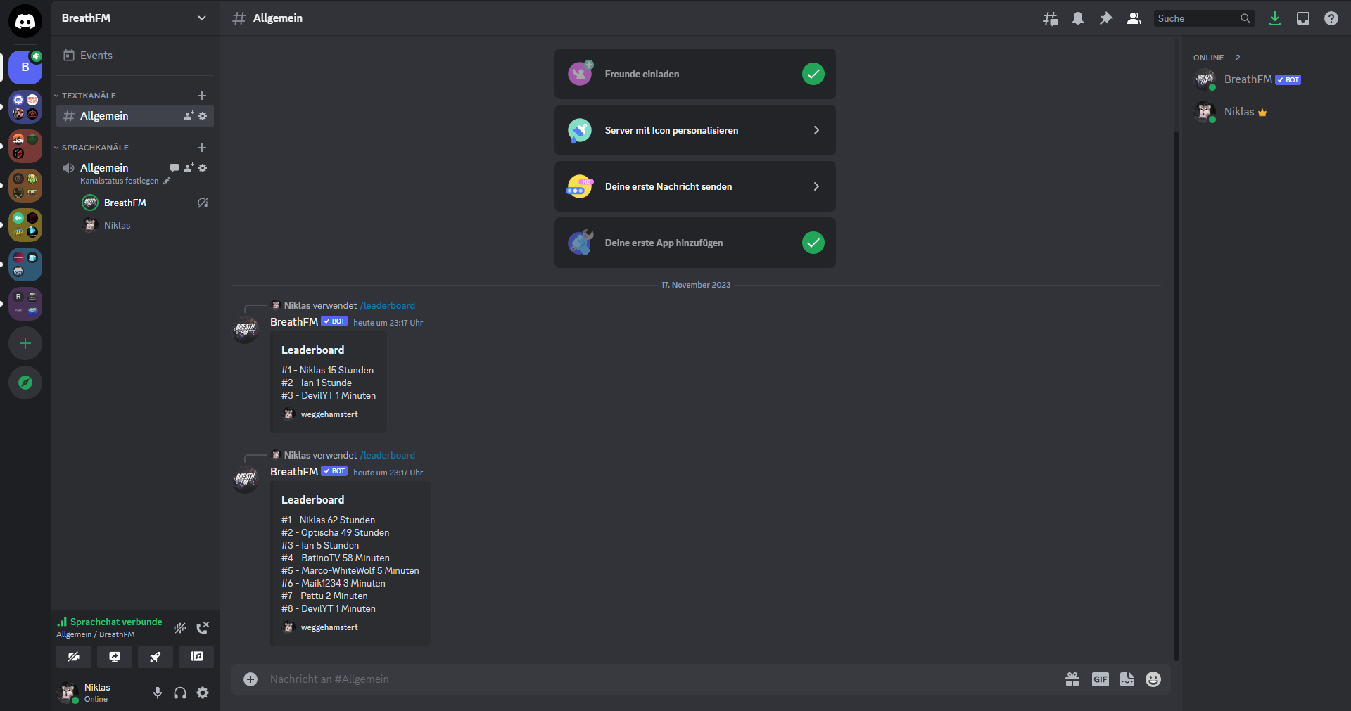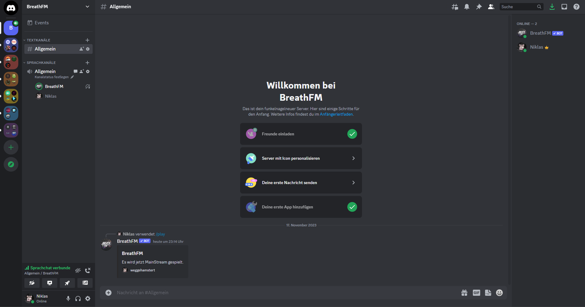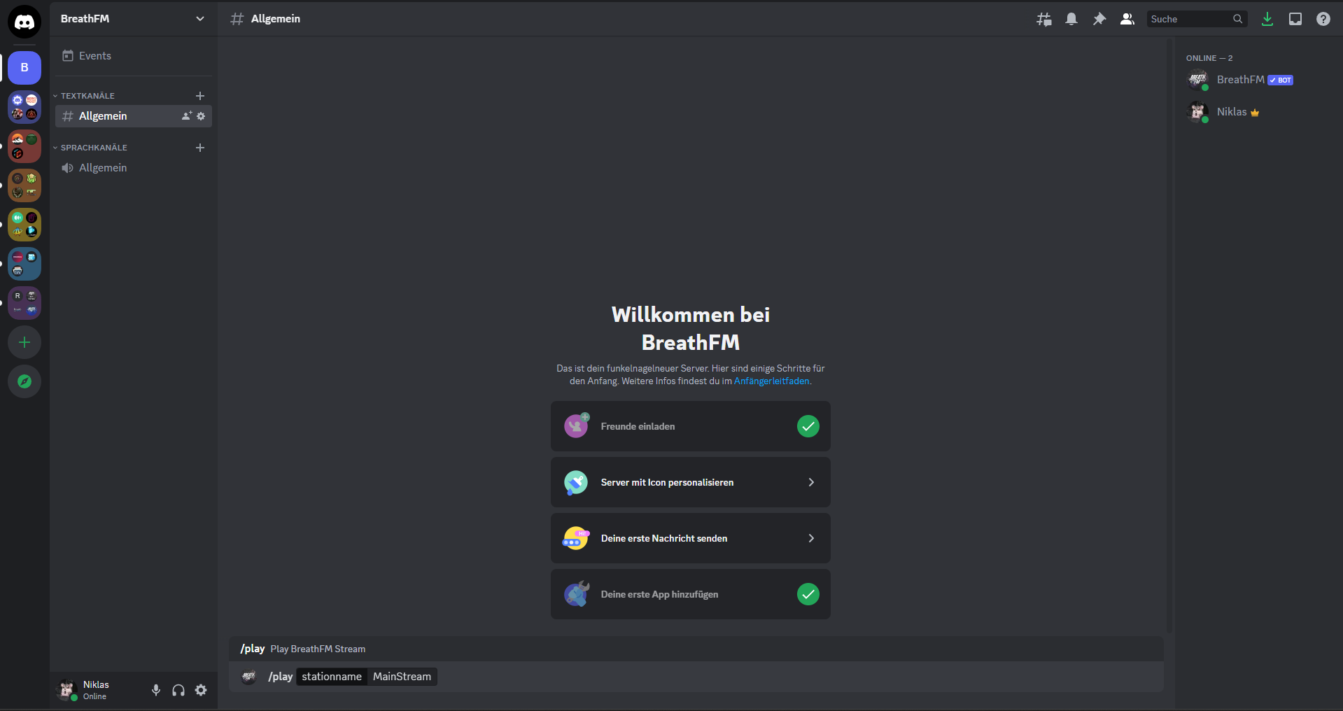 /playSpielt BreathFM im Voice Channel ab/songZeigt den aktuell gespielten Song an/langÄndert die Sprache des Bots/leaderboardZeigt die Hörzeit-Bestenliste/rankZeigt deine aktuelle Hörzeit/infoInformationen über BreathFM/settings alwaysconBot bleibt dauerhaft verbunden/settings defaultchannelStandard Voice Channel festlegen/settings showpictureAlbum-Cover anzeigen/verstecken